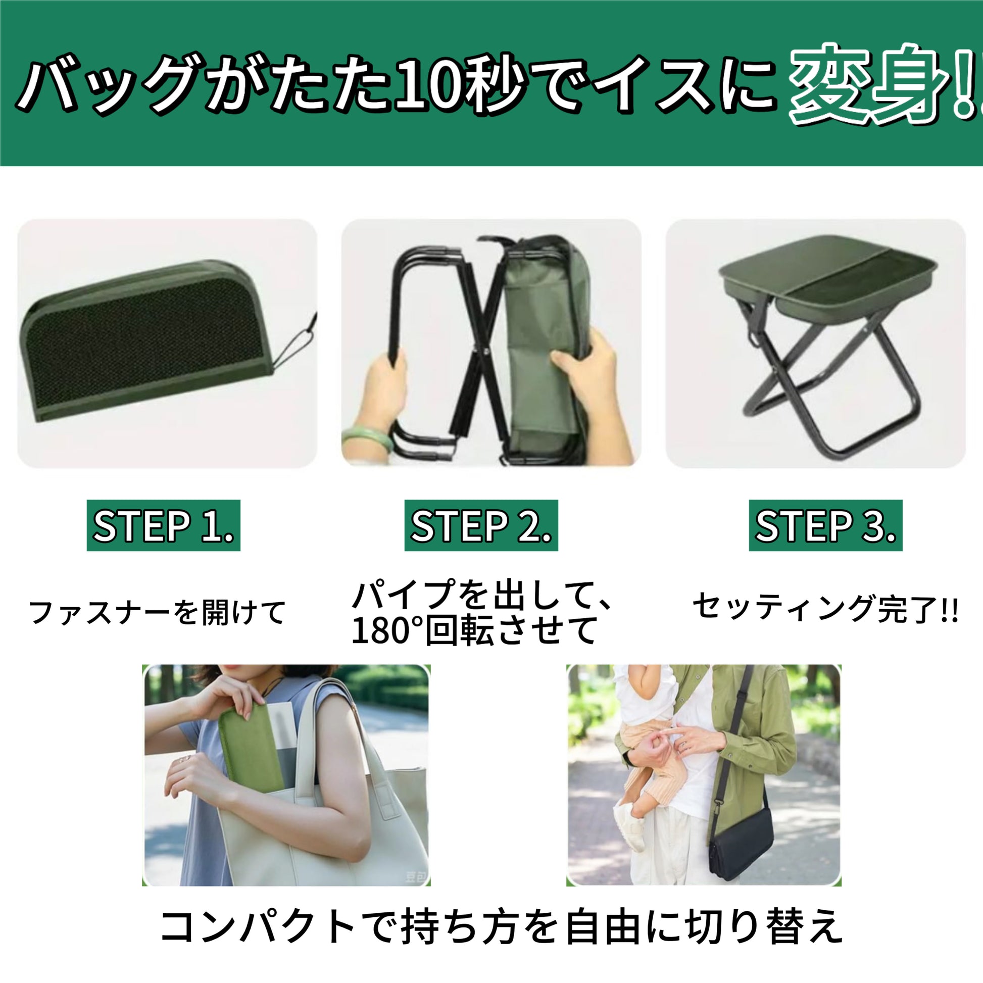 荷物を入れられるミニバッグとして使えて、疲れたときは椅子に変身して脚を休められます。